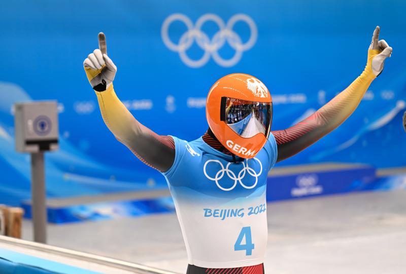 新华社相片,北京,2022年2月11日\n (新华全媒+·北京冬奥会)钢架雪车——须眉钢架雪车赛况\n 2月11日,冠军德国选手克里斯托弗·格罗特赫尔在荒谬庆祝。\n 当日,北京2022年冬奥会须眉钢架雪车比赛在国度雪车雪橇中心举行。\n 新华社记者 江文耀 摄
